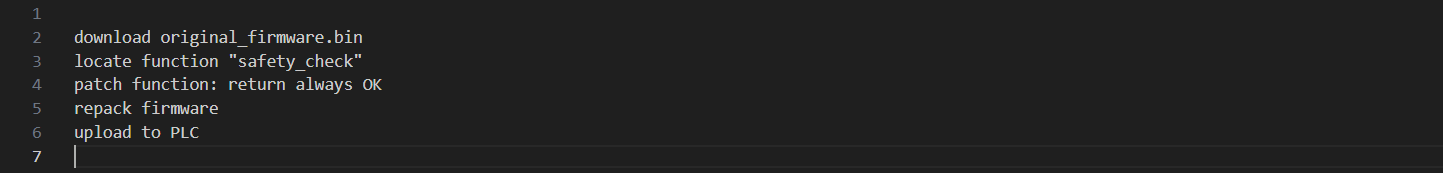 نمونهای از حمله Firmware Hijacking؛ مهاجم با تغییر در Firmware اصلی PLC (مثلاً حذف یا غیرفعالکردن تابع safety_check) میتواند کنترل کامل سیستم ایمنی را دور بزند.